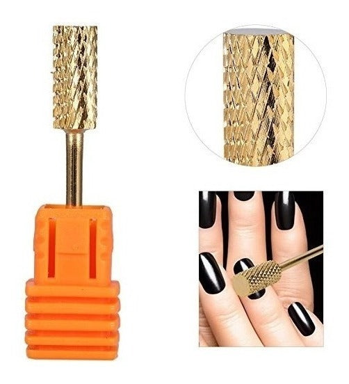 Esta punta está hecha de metal de tungsteno en color dorado, ideal para usar en taladros de uñas. Perfecta para eliminar cutículas y piel muerta de manera efectiva, así como para dar forma y suavizar las uñas de gel o acrílico. Esencial para mantener unas uñas limpias y bien cuidadas con precisión y durabilidad.